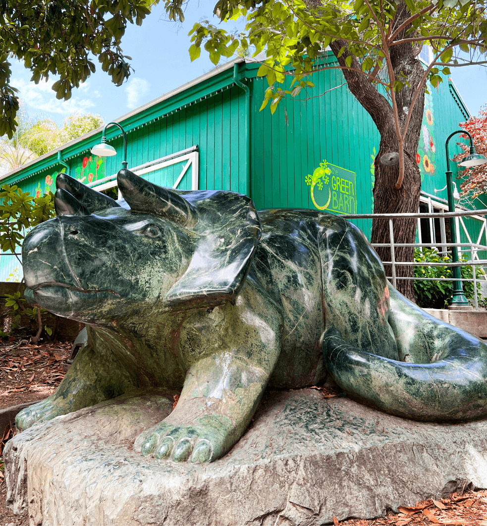 Rocko was originally sculpted out of a 20-ton bolder for Knott’s Berry Farm’s Knott’s Kingdom of Dinosaurs attraction before being moved to Camp Snoopy section of the park. It was carved between January and February 1988 (Reference). Rocko was donated to Gilroy Gardens and is now proudly located along the Park’s midway just in front of The Green Barn, where guests can explore science and nature in a unique learning space.
